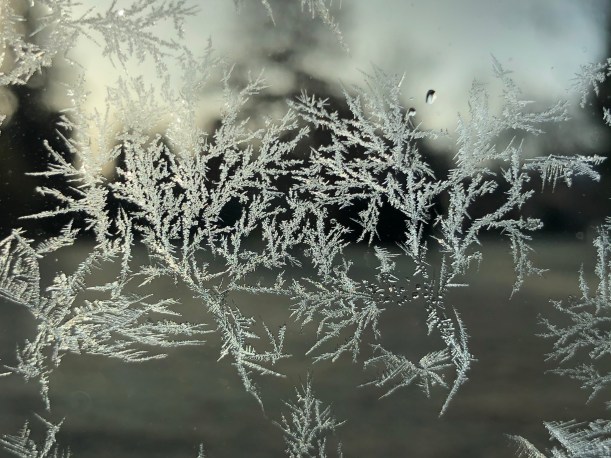In the cold, still hours of dawn, the frost surrounds me. Like a fortress, ice cakes the windows.