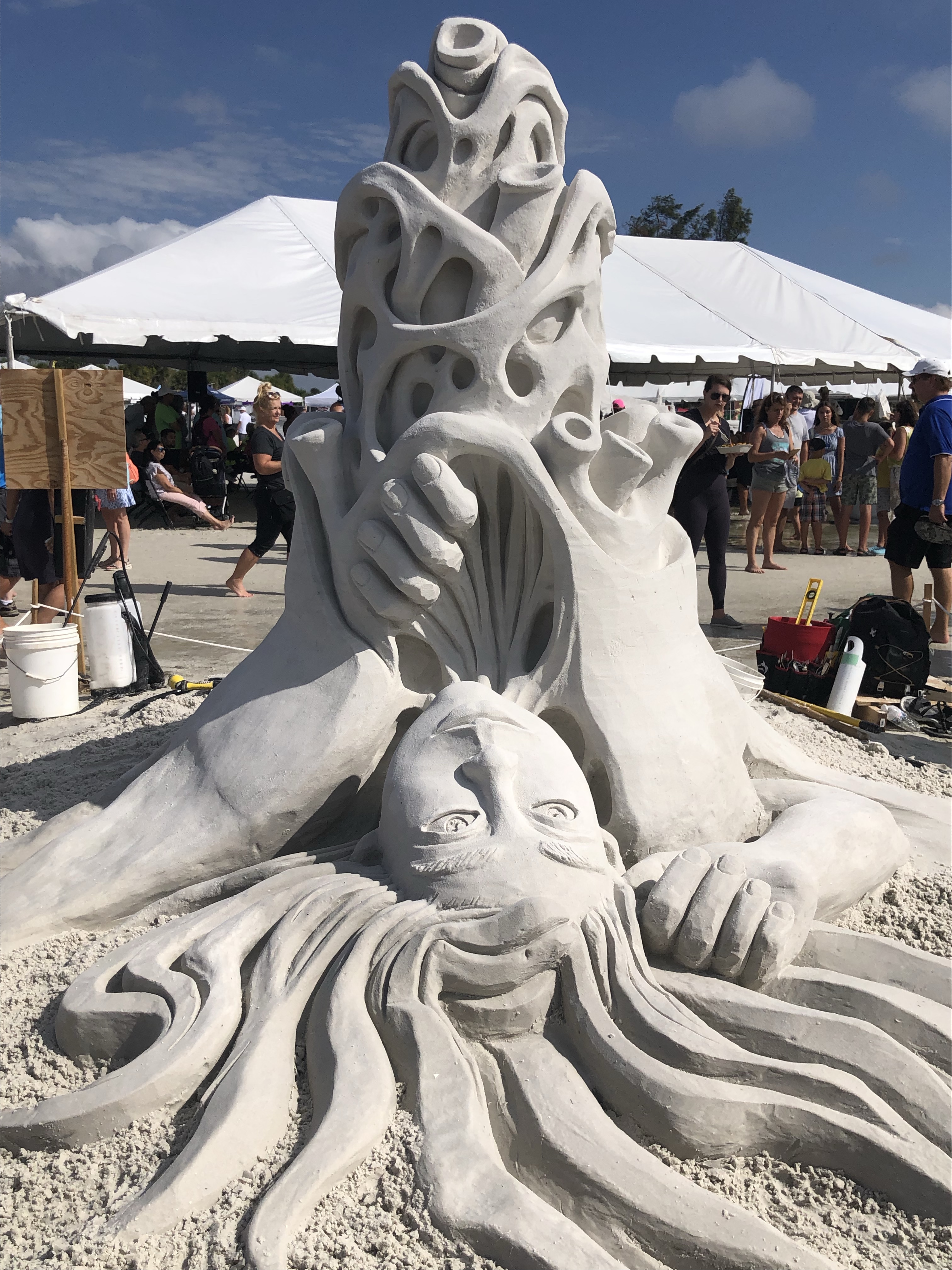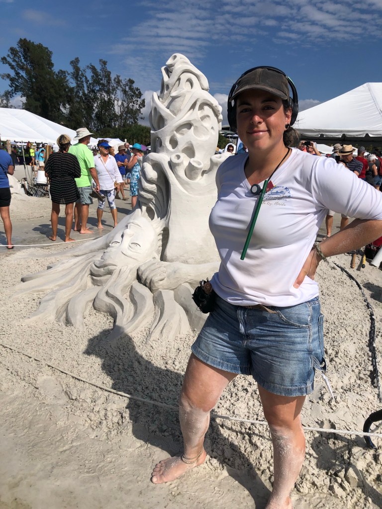Artwork Credits: This beautiful sand sculpture was hand crafted by Isabelle Gasse at the 2022 Siesta Key International Sand Sculpting Festival. Isabelle is a well known ice and snow carver from Quebec, Canada, who is enjoying the fact that she can do this carving in shorts. Her carvings are as exceptional as her spirit.